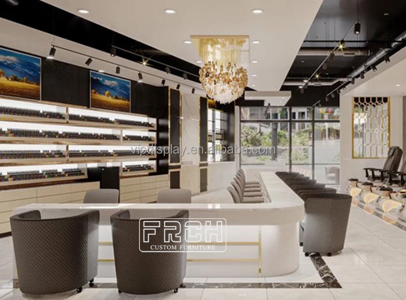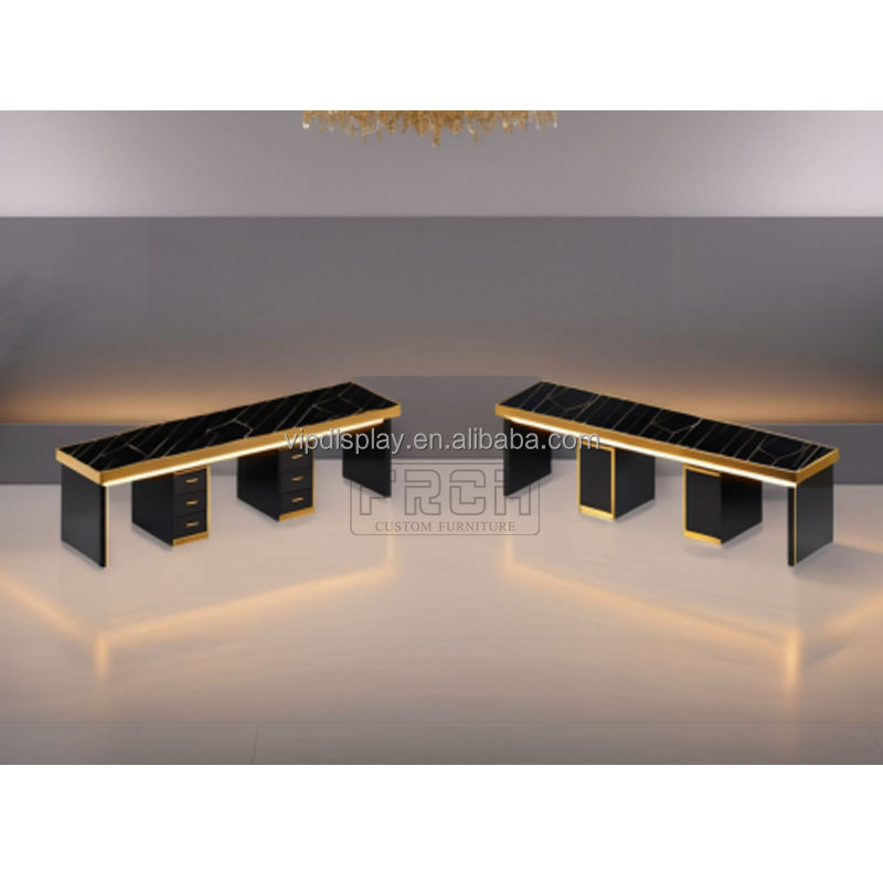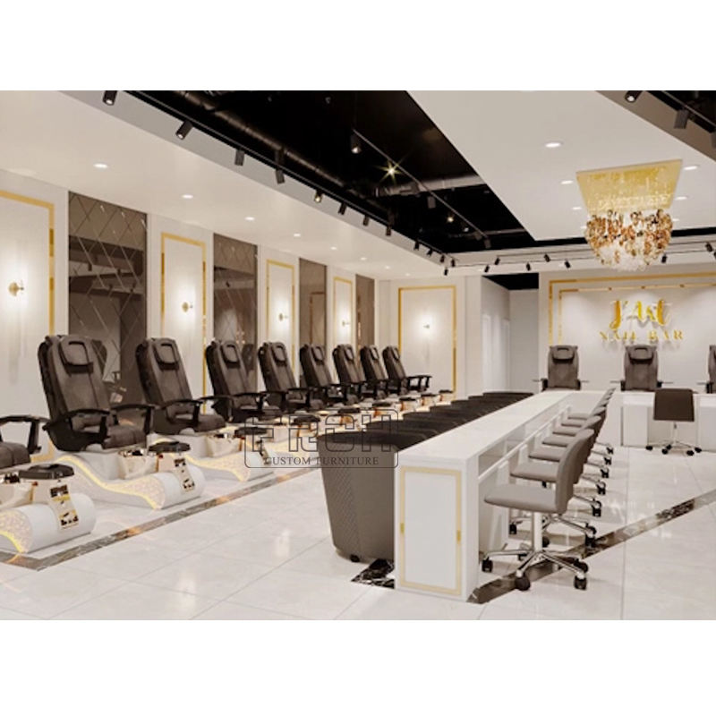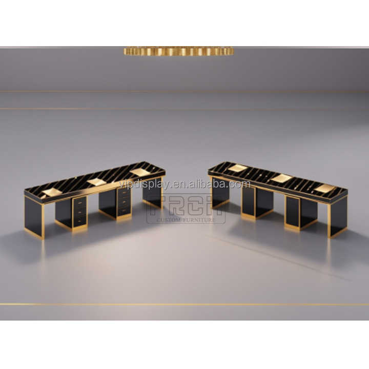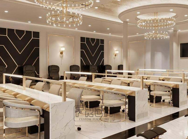 Mesa de manicura de uñas triple clásica dorada diseño largo completo personalizado Escritorio de uñas estilo moderno con ventilador