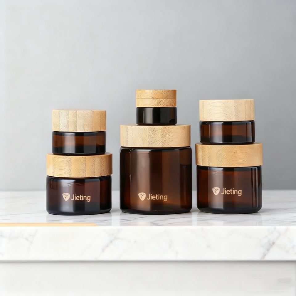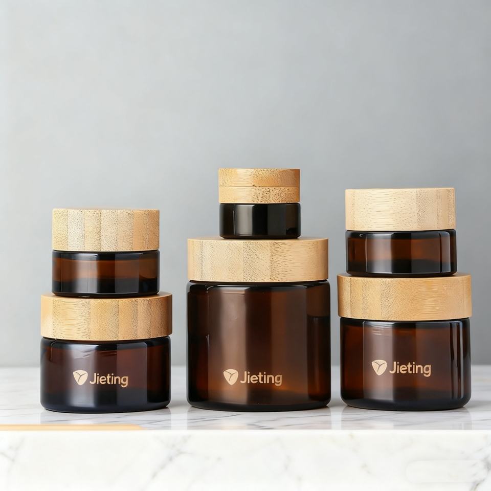 Envase Personalizado de Vidrio Ámbar para Crema Facial y Cosméticos de 5ml, 15ml, 30ml, 50ml y 100ml con Tapa de Madera de Bambú