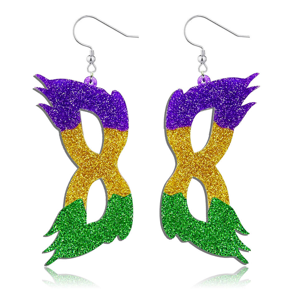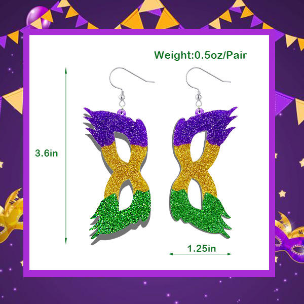 Pendientes de Mardi Gras con Diseño de Máscara, Acrílicos, Colgantes, en Morado, Verde y Dorado, para Mujer