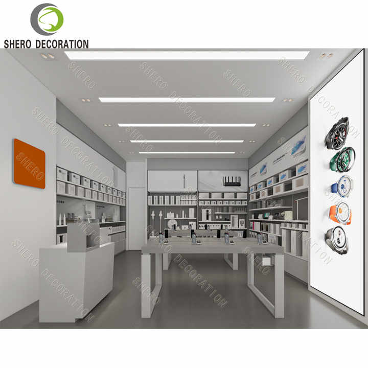 Accesorios de teléfono móvil personalizados, vitrina de tienda, tienda de diseño de interiores, mesa de teléfono móvil blanca