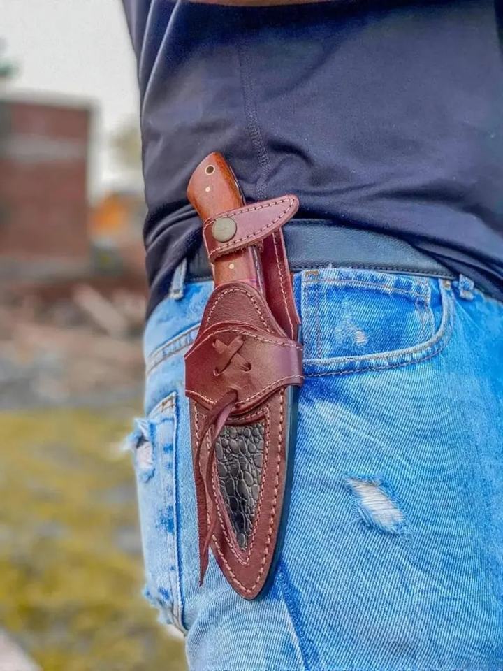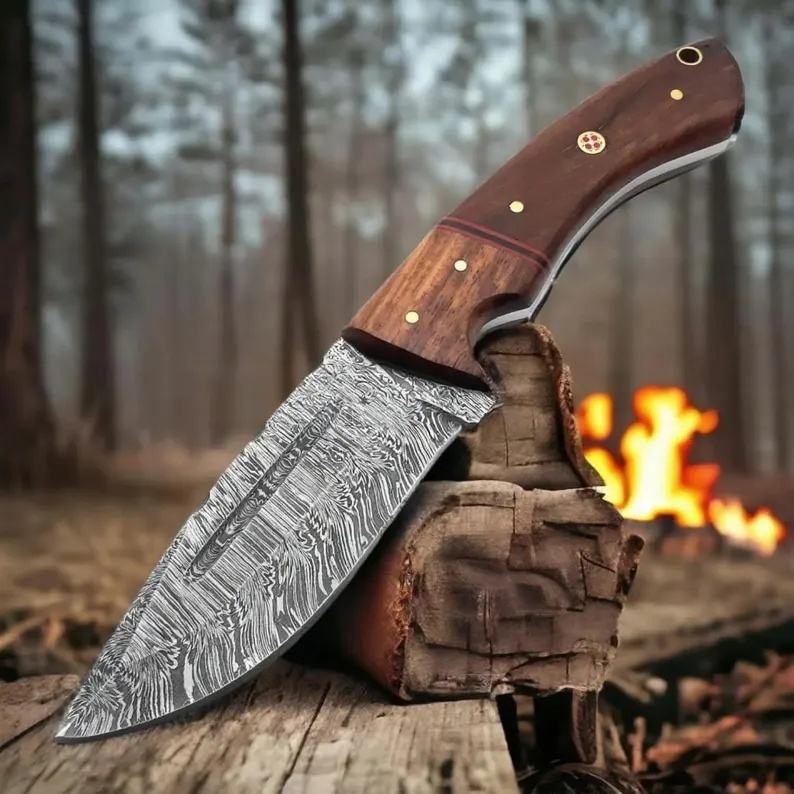 Cuchillo de Caza de Hoja Fija de Acero de Damasco Hecho a Mano Personalizado | Cuchillo de Supervivencia para Campismo al Aire Libre con Mango de Madera, Tamaño Personalizable