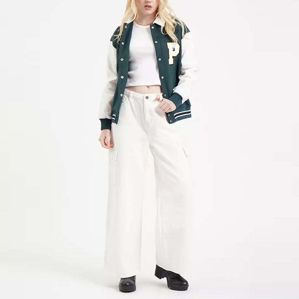 Chaqueta Universitaria Personalizada para Mujer, de Lona a Cuadros Verde Oscuro y Blanco, Resistente al Viento, Ecológica, Estilo Universitario, Ropa de Calle