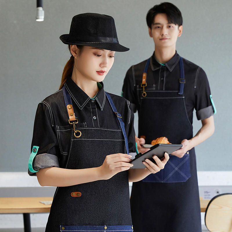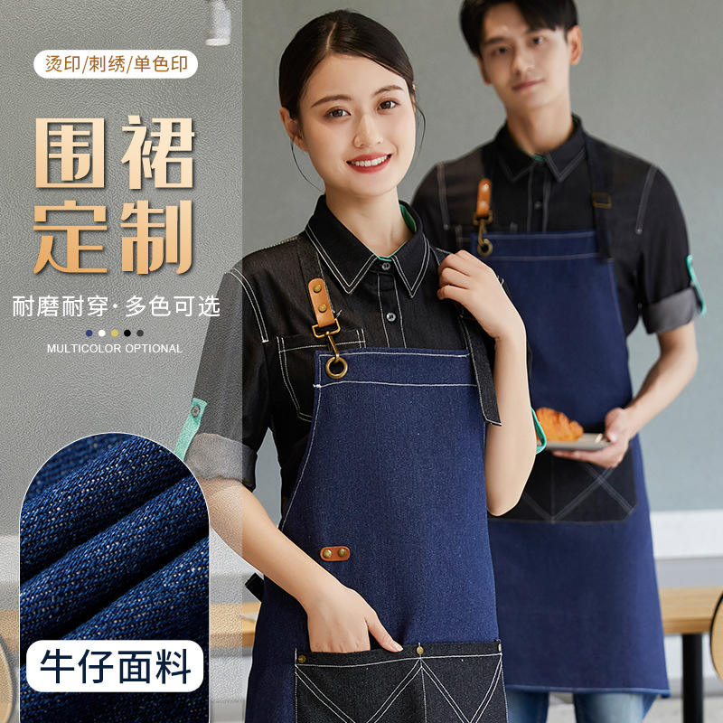 Delantal de mezclilla personalizado con bordado de logotipo para cocina, cafetería, tienda de té, ropa de trabajo