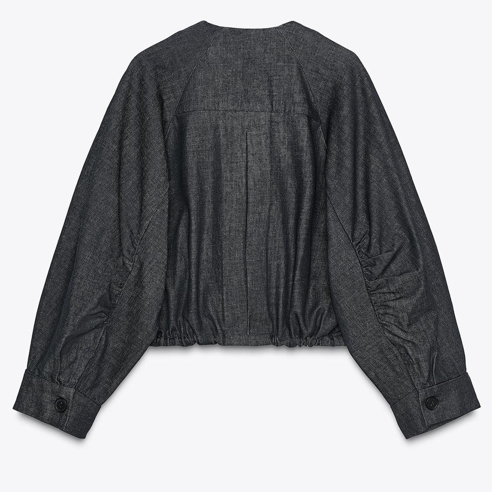 Chaqueta bomber acolchada de mezclilla personalizada, manga larga, cuello, bolsillos delanteros, dobladillo ajustable, cordones, cierre frontal, botones ocultos
