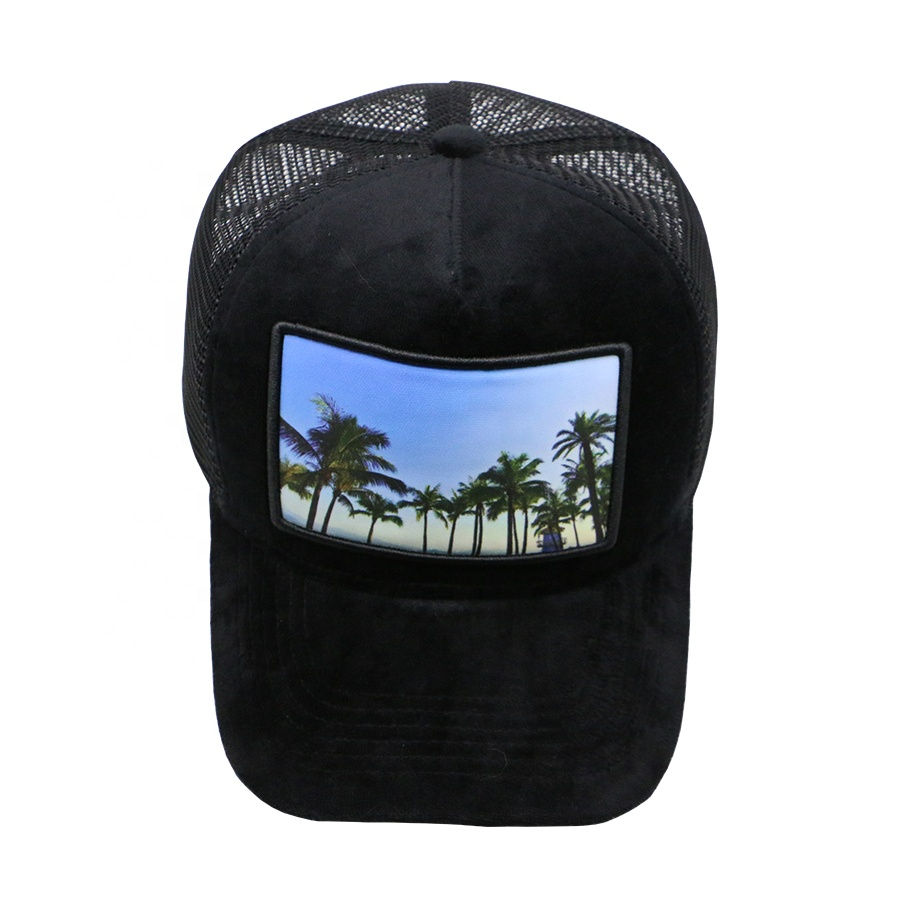 Diseño personalizado de 5 paneles de malla de terciopelo gorras de camionero parche de impresión 3D bordado marco gorras de camionero