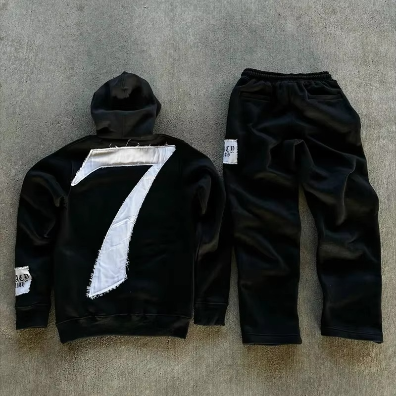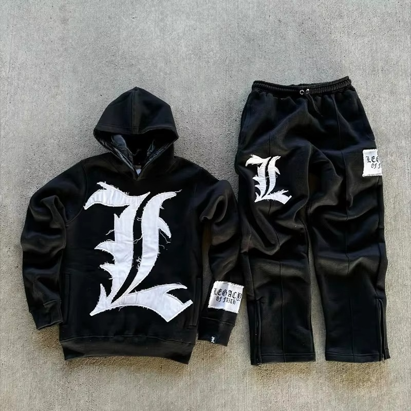 Conjunto de pantalones de chándal y Sudadera con capucha de pierna ancha recta con parche bordado con apliques de diseño personalizado, chándales de algodón de peso pesado para hombre