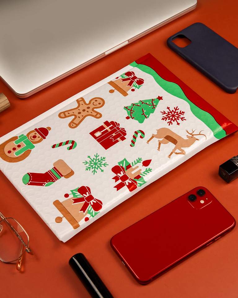 Bolsas moradas impermeables para embalaje de correo, diseño personalizado, a granel, color verde azulado, con burbujas de Navidad