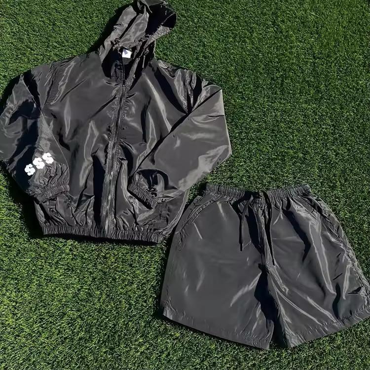 Conjunto de Chaqueta Cortavientos con Capucha y Pantalones Cortos de Diseño Personalizado, Unisex, para Invierno, en Color Sólido, con Bloques de Color, de Algodón Orgánico