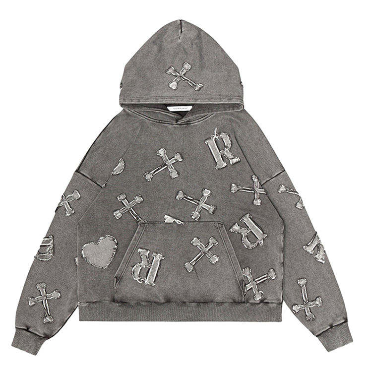 Custom Angustia Parche bordado Sharp Hood Sudadera con capucha Rhinestone Acid Washed Color Hoodie Full Rhinestones Hoodie