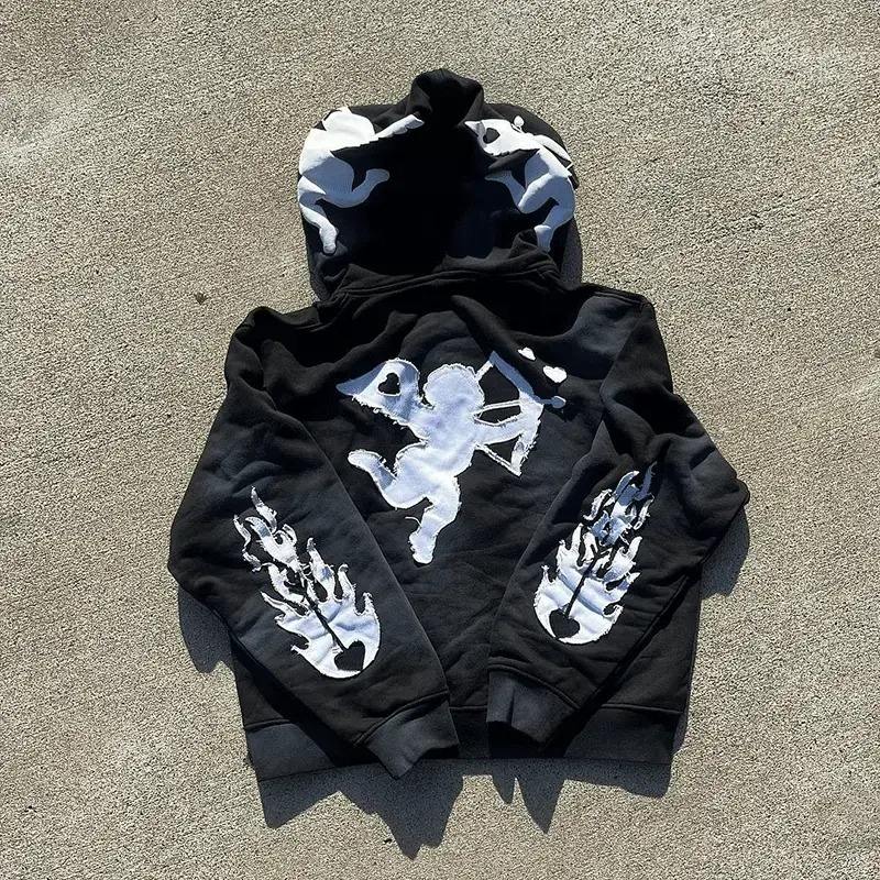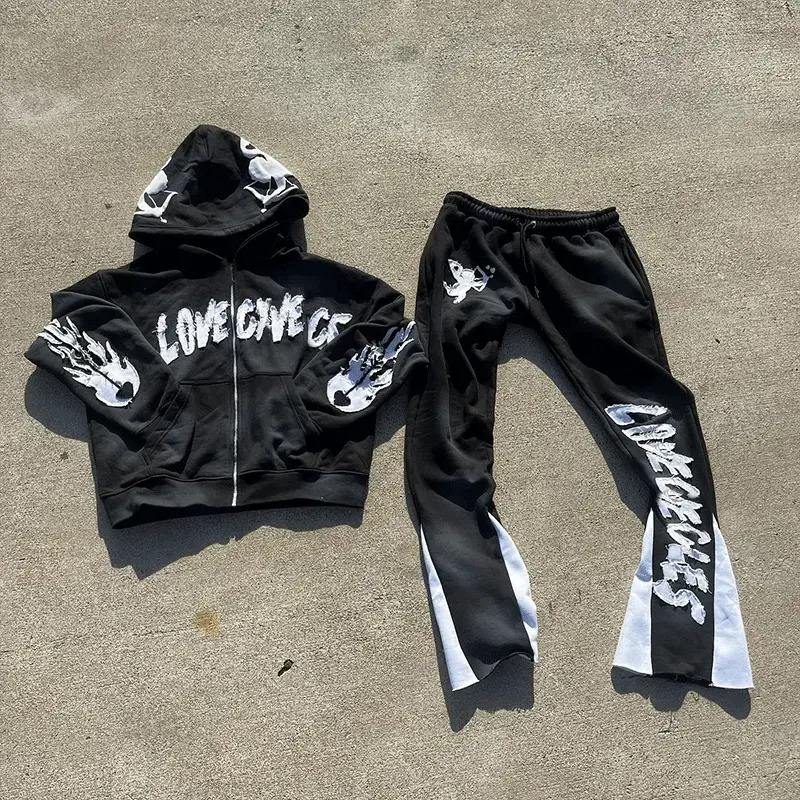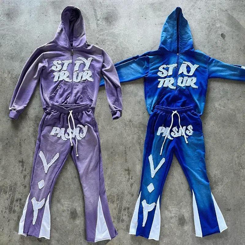 Conjuntos de dos piezas con logotipo bordado y apliques desgastados personalizados, chándal para correr, chándal acampanado Unisex, lavado ácido, trajes para correr para hombres