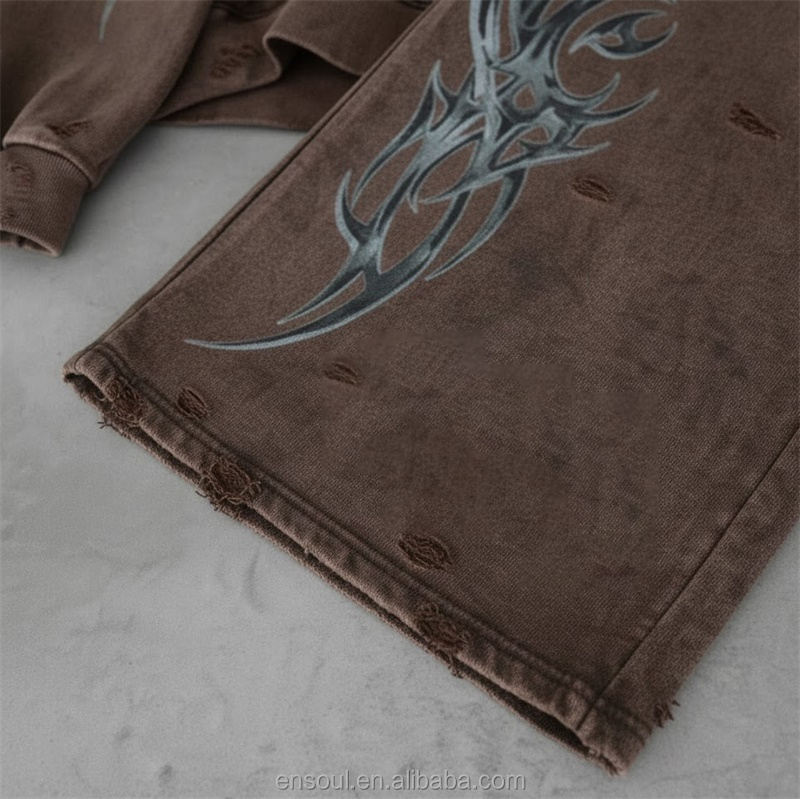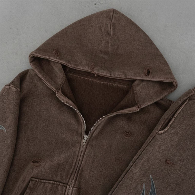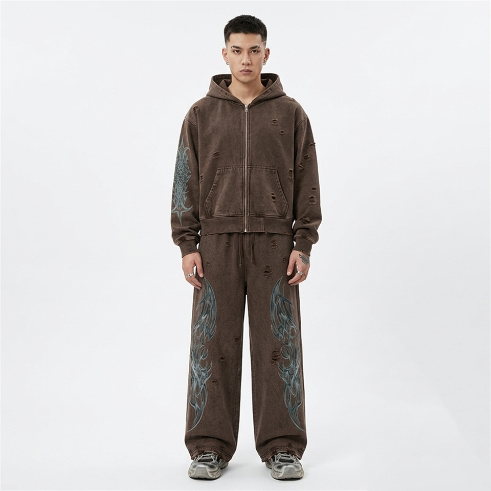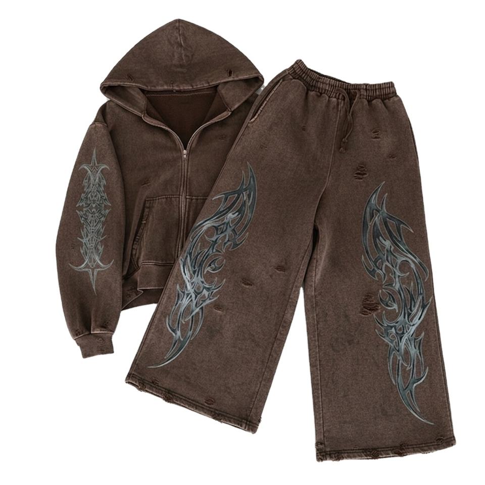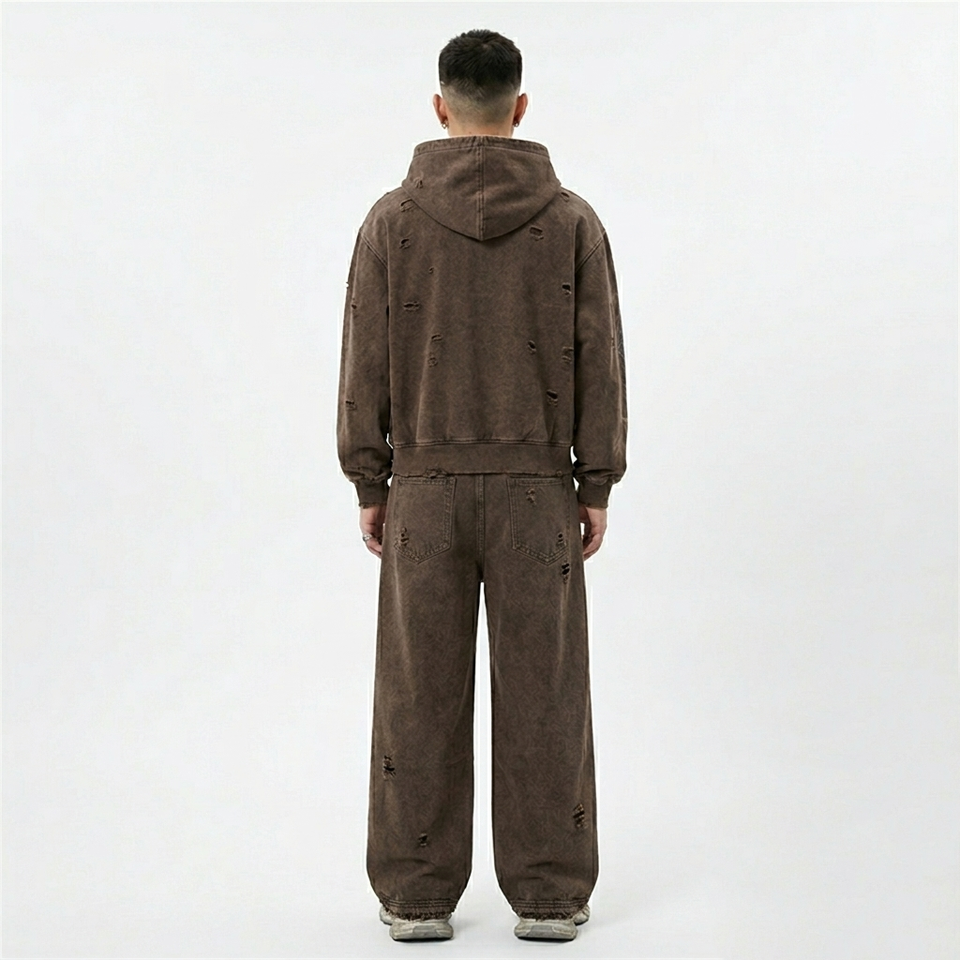 Conjunto Deportivo Marrón Desgastado Personalizado con Sudadera con Cremallera y Pantalones Deportivos Acampanados, Acabado Lavado al Ácido, Tela Suave, Elegante, Unisex