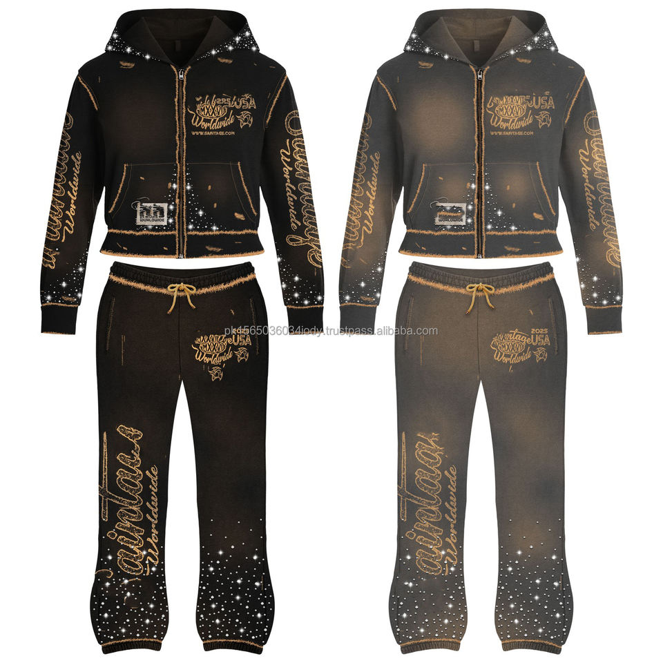 Conjunto Deportivo Personalizado con Estampado DTG Desgastado, Estilo Francés, Lavado Ácido Decolorado al Sol, Sudadera con Capucha y Pantalones Deportivos para Hombre