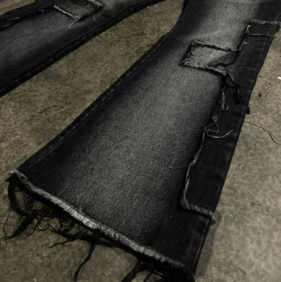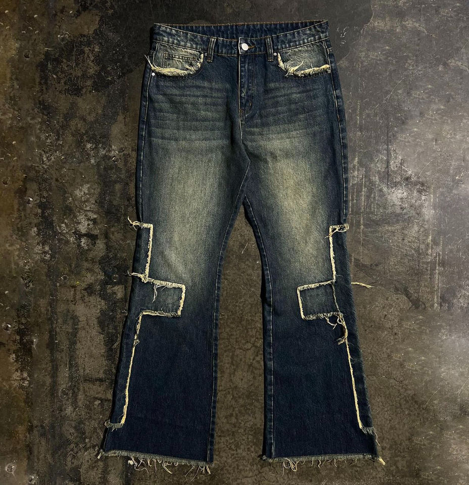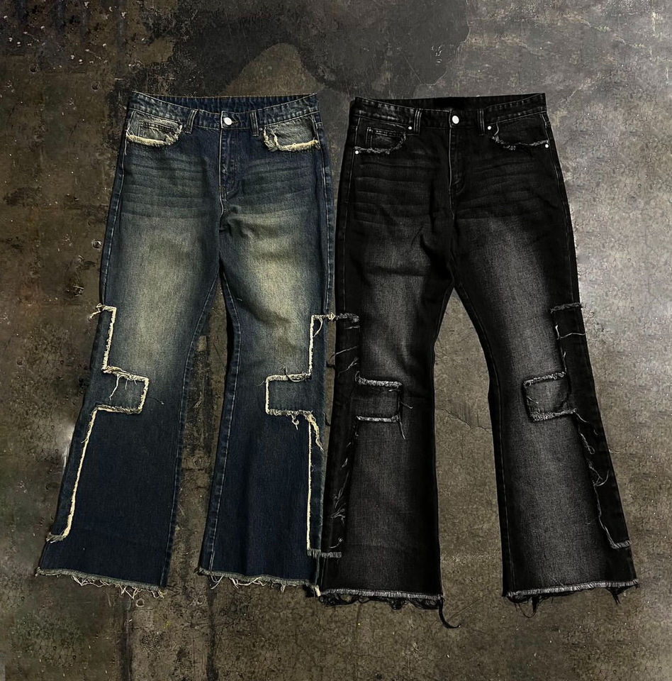 Pantalones de mezclilla desgastados bordados personalizados, ropa de calle personalizada, pantalones vaqueros de mezclilla acampanados vintage holgados de gran tamaño para hombres