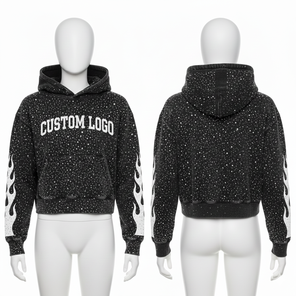 Sudadera con capucha corta personalizada con bordado desgastado para mujer, estilo streetwear, con pedrería, cremallera y lavado ácido.