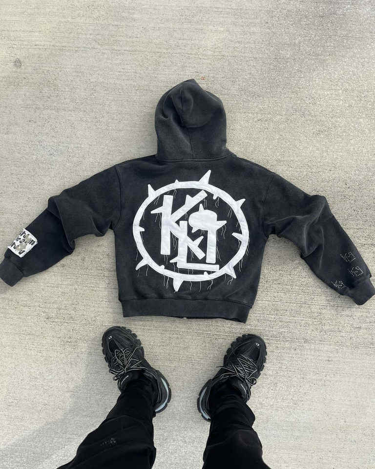 Suéter con apliques de parche bordado desgastado personalizado 500GSM French Terry Oversized Zip up Acid Wash Hoodies