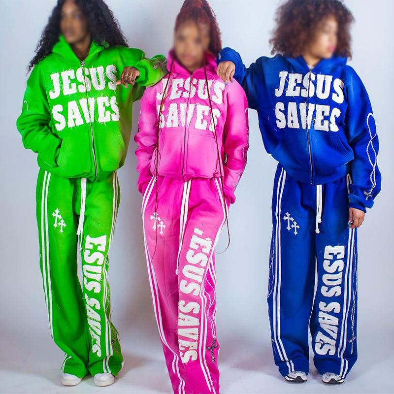 Conjunto de pantalones de chándal con cremallera y bordado estampado desgastado personalizado, ropa de calle para hombre, chándal con diamantes de imitación, lavado ácido desteñido por el sol