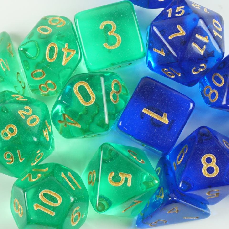Verde y azul D4, D6, D8, D10, D12 juego de dados poliédricos transparentes