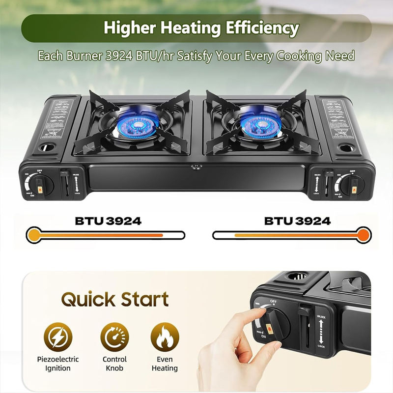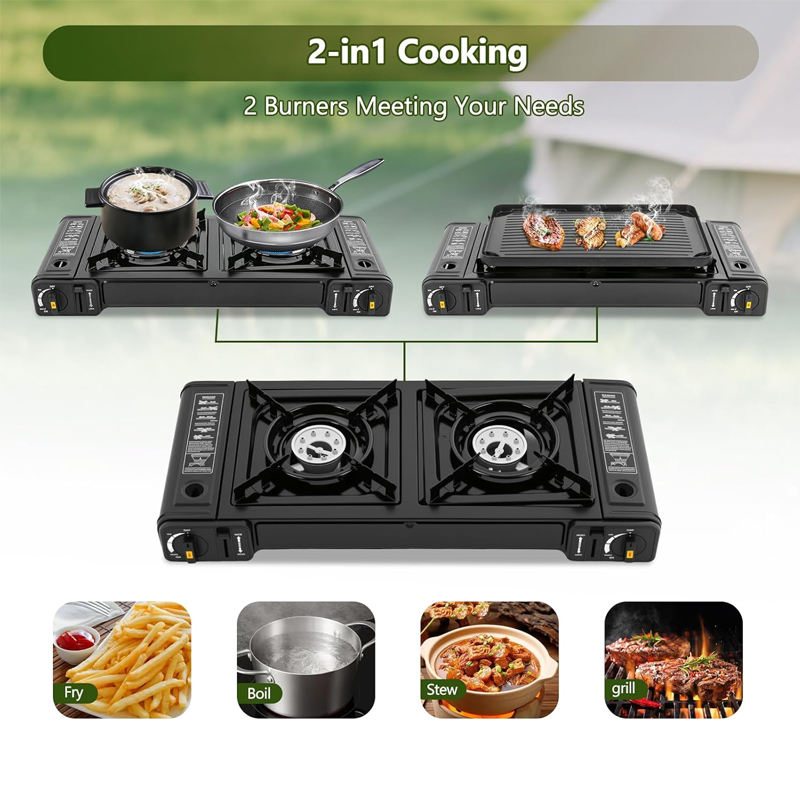Estufa de Butano de Doble Quemador Personalizada con Encendido Automático y Características de Seguridad, Estufa Portátil para Camping con Sartén Antiadherente