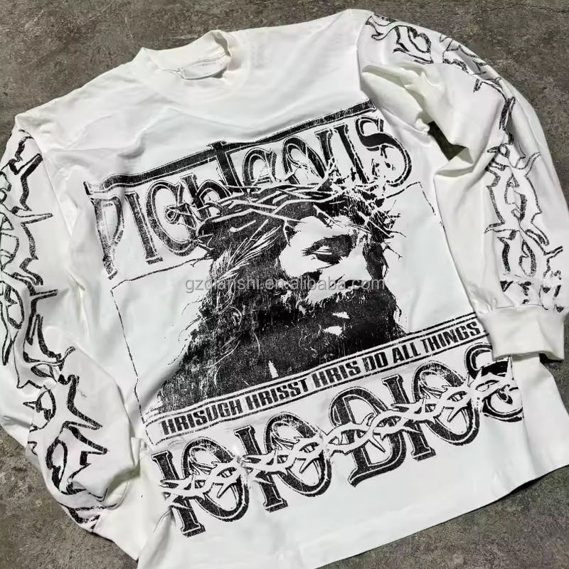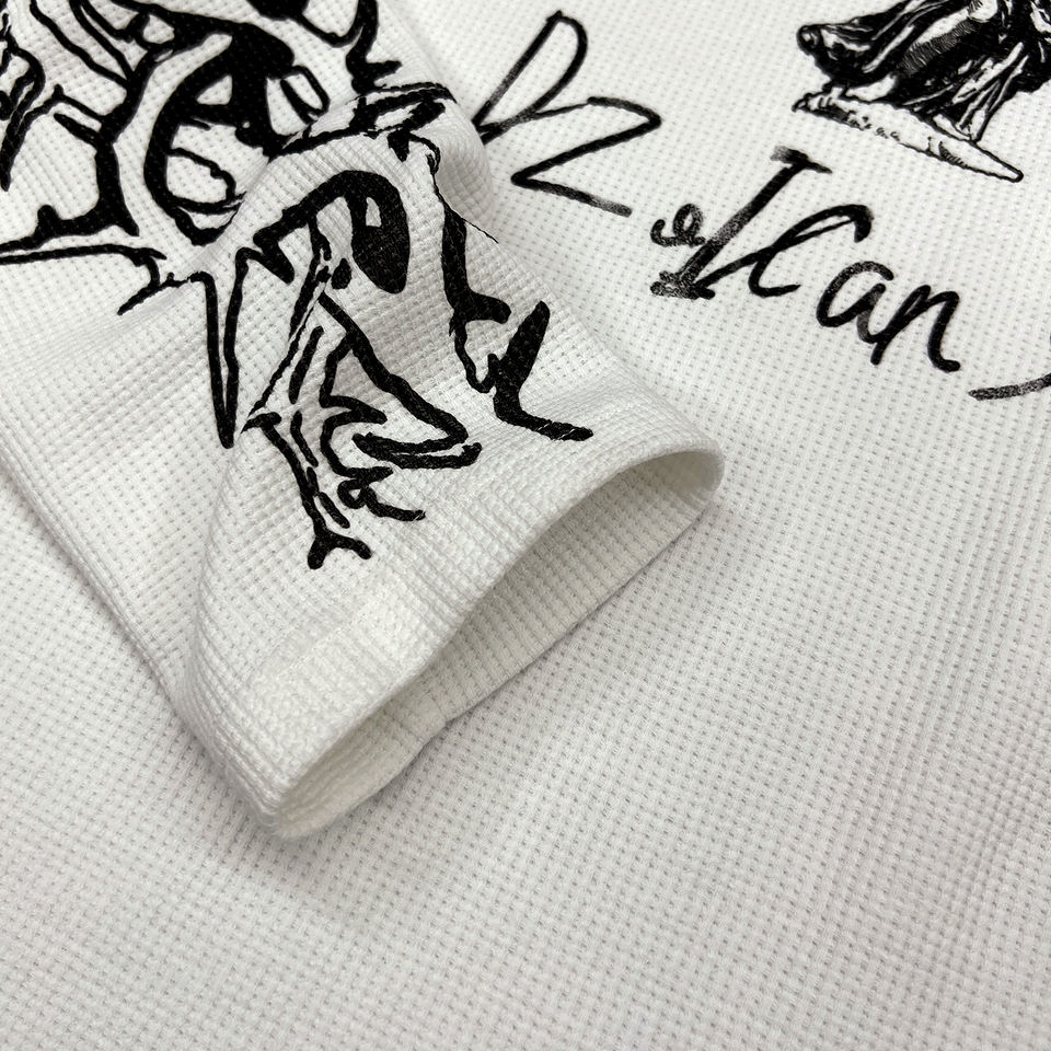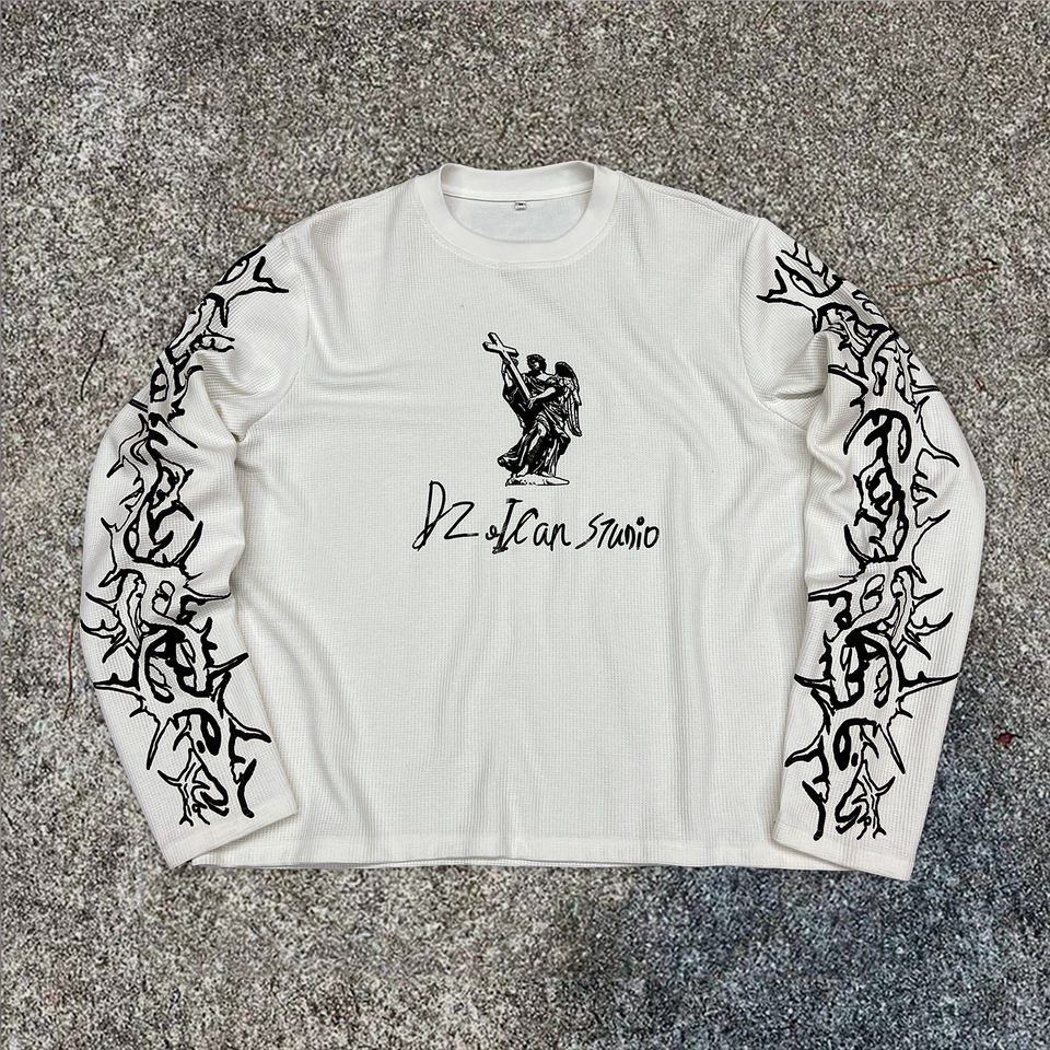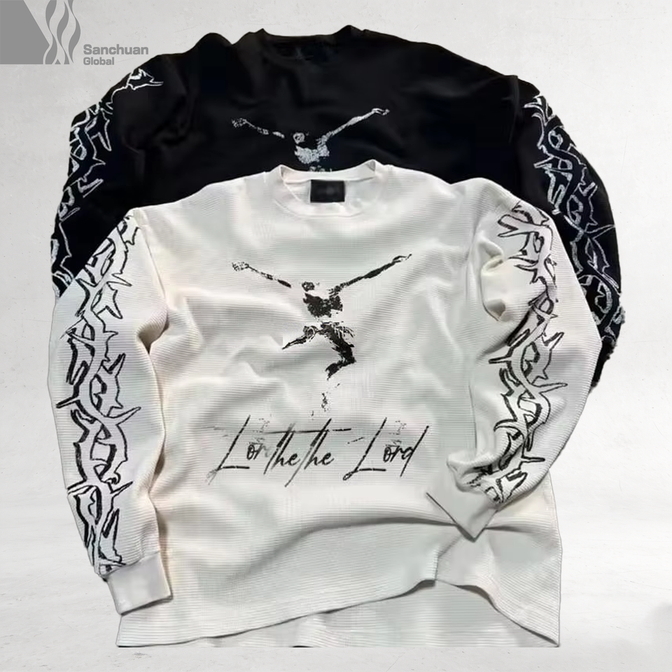 Camiseta Gráfica Personalizada con Impresión DTG, Camiseta Térmica Blanca de Manga Larga para Hombre, Camiseta de Manga Larga de Punto Waffle Oversize