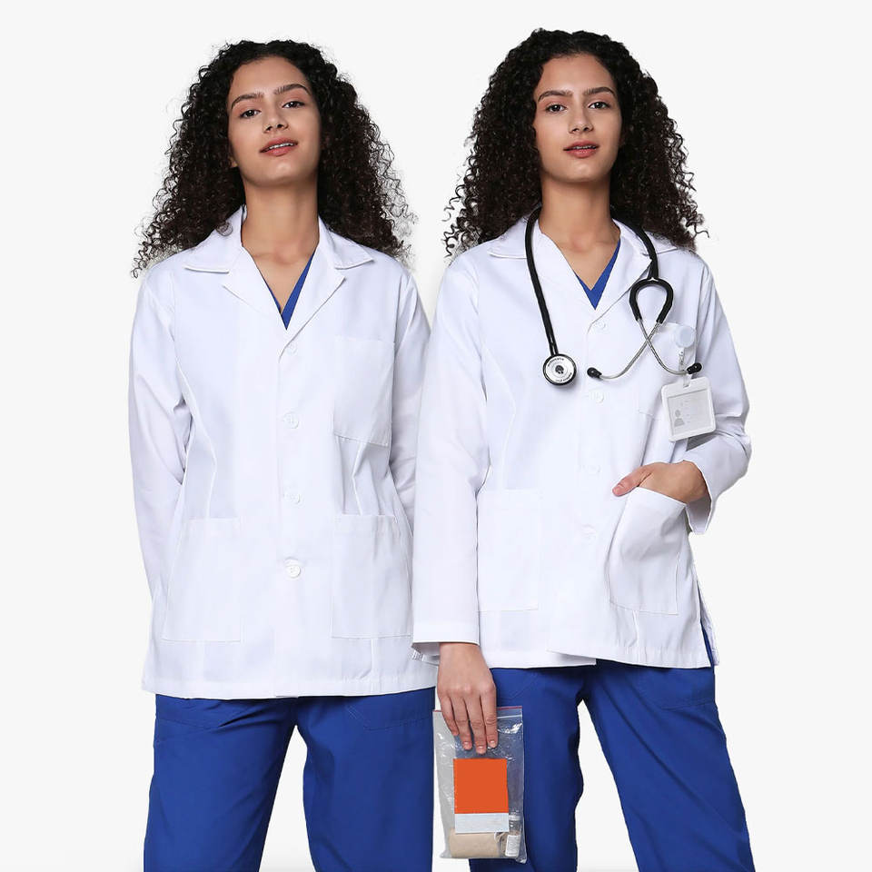 Bata de laboratorio duradera personalizada, mezcla de algodón polivinílico, tela transpirable resistente a las manchas para mujeres, personal médico