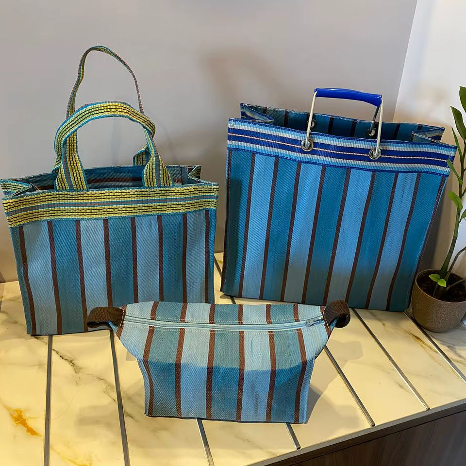 Bolso de compras a rayas tejido plástico cremallera reutilizable respetuoso con el medio ambiente hecho a mano bolsas de playa recicladas estuches para cosméticos