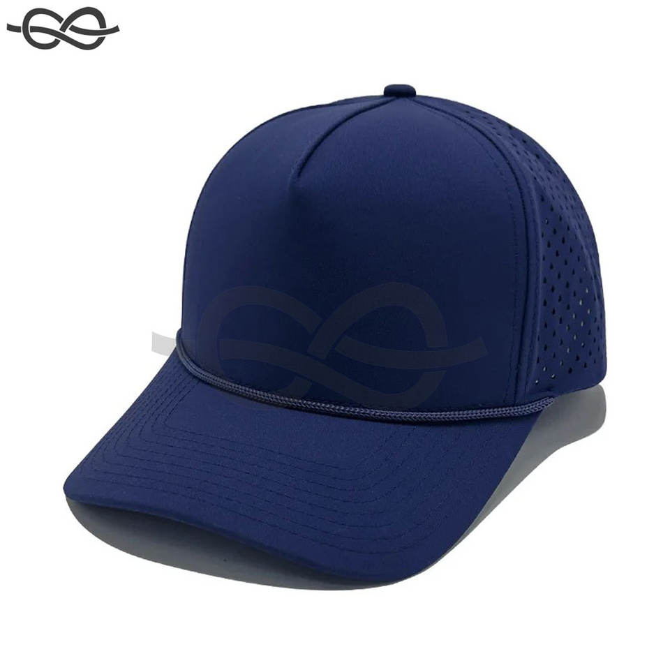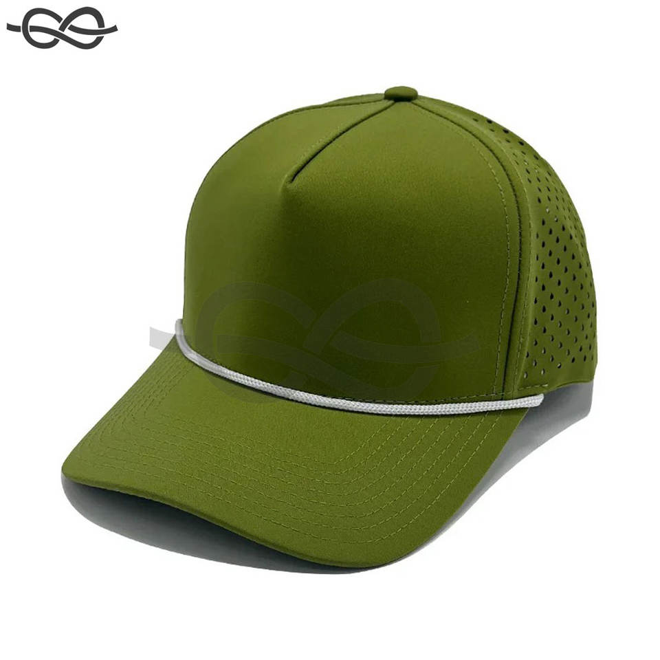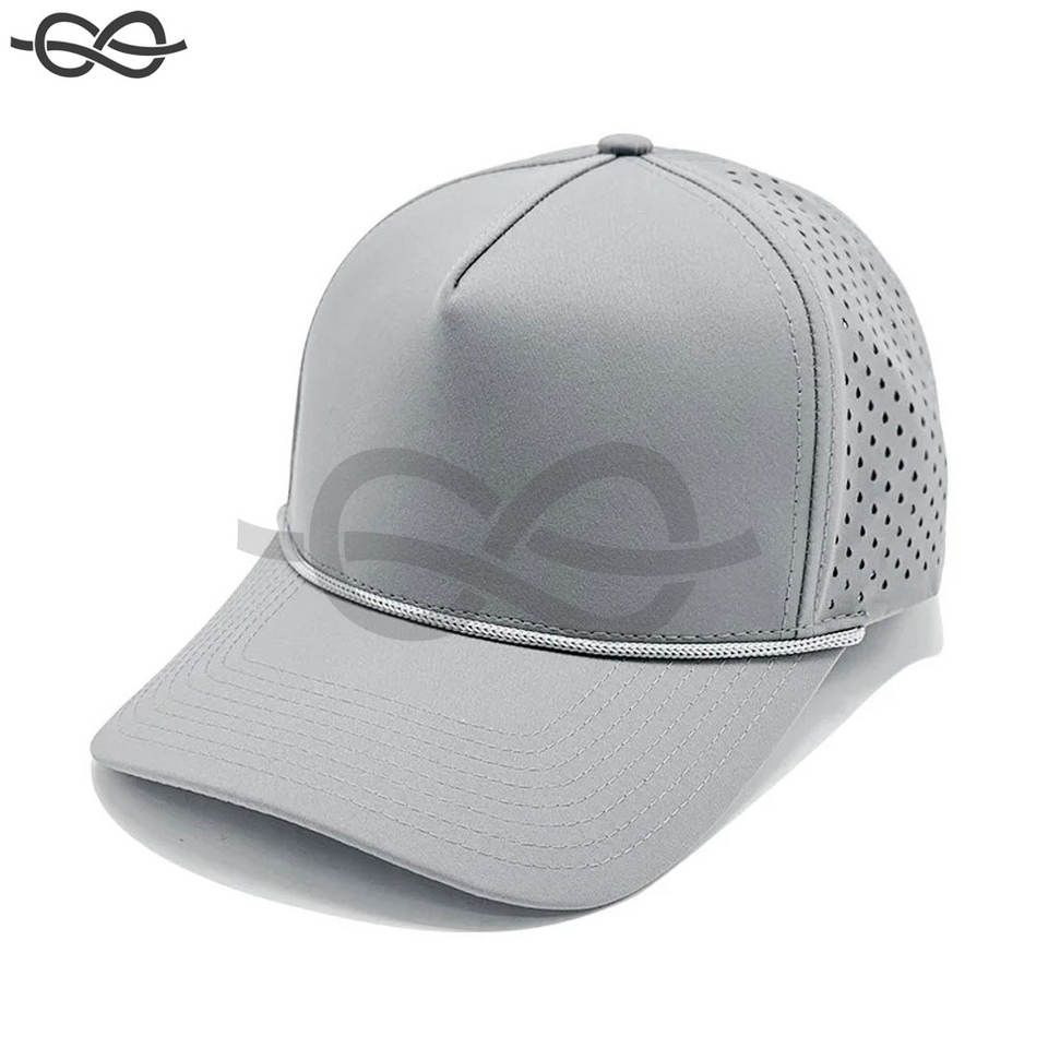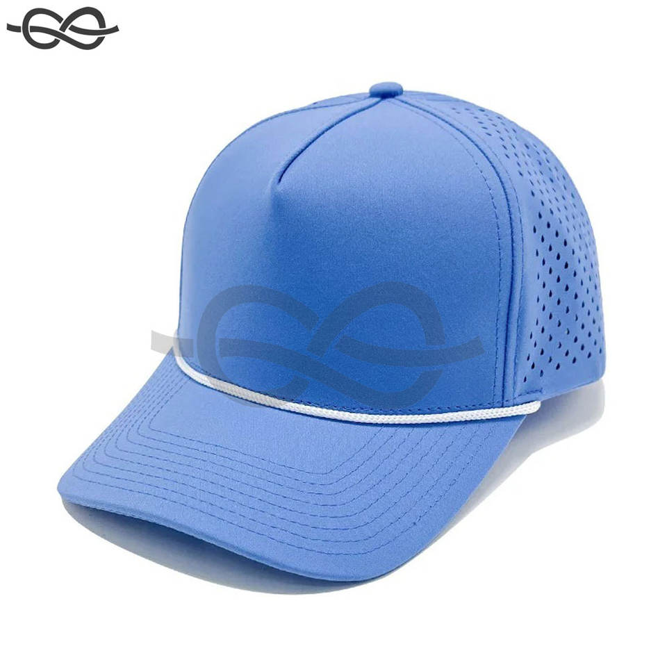 Gorra de béisbol trucker de 5 paneles de malla transpirable bordada a medida, personalizada con cierre snapback y cuerda a juego, ajustable, de alto rendimiento, para playa