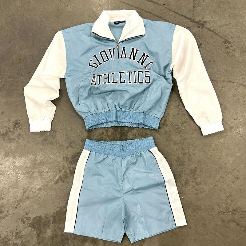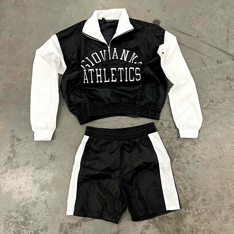 Conjunto Deportivo Personalizado con Logotipo Bordado, Chaqueta Corta con Media Cremallera y Pantalones Cortos de Nailon, Alta Calidad