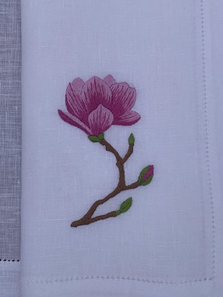 Juego de manteles individuales y servilletas de flores rosadas bordadas personalizadas, alfombrillas de lino blanco Hemstitch para decoración de mesa de cocina, uso en restaurante y hogar