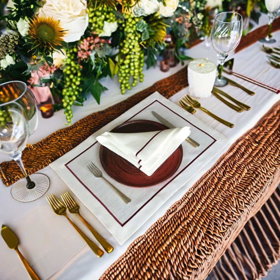 Juego de servilletas individuales con borde de línea roja bordada personalizada, alfombrillas de lino blanco, lavables, bodas, eventos de hotel en casa