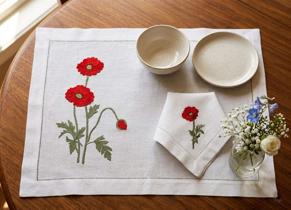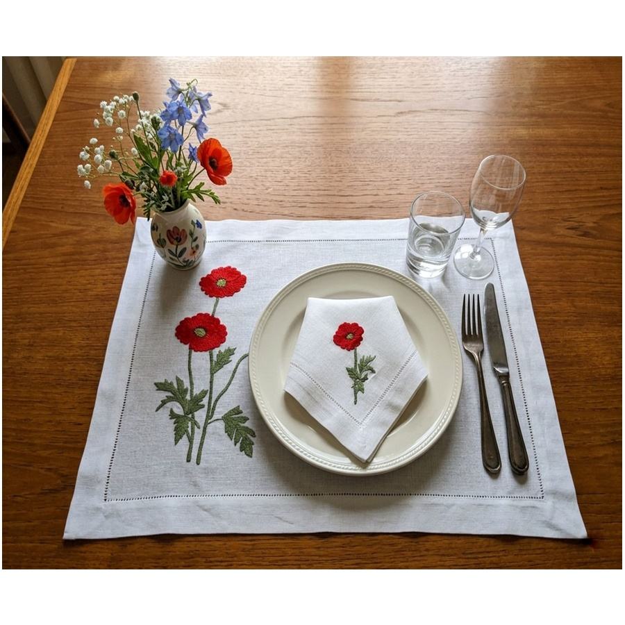 Juegos de Manteles Individuales y Servilletas Bordados Personalizados con Flores de Amapola Roja, Lavables, con Dobladillo, 100% Lino Blanco, para Bodas, Eventos en el Hogar