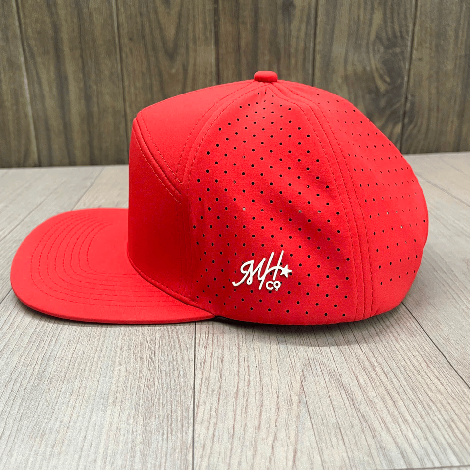 Bordado personalizado 7 Panel Flat Brim Rojo Poliéster Impermeable Gorras Laser Cut Hole Snapback Gorras Sombreros con logotipo personalizado