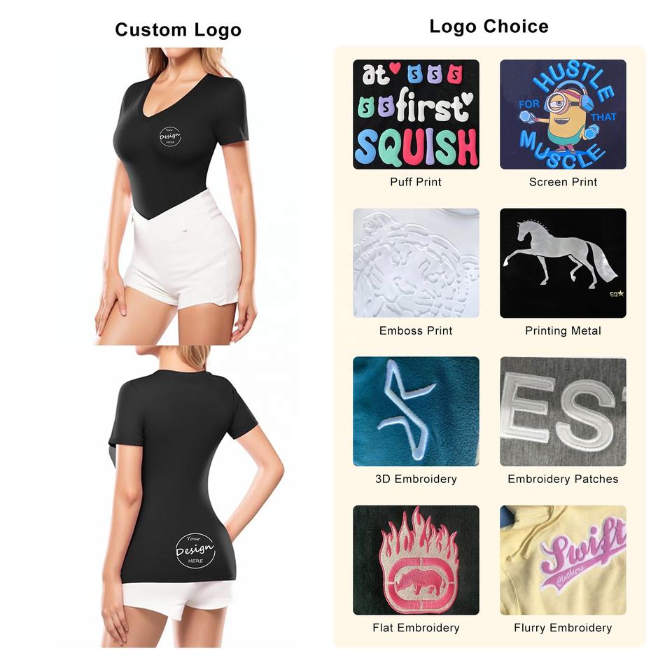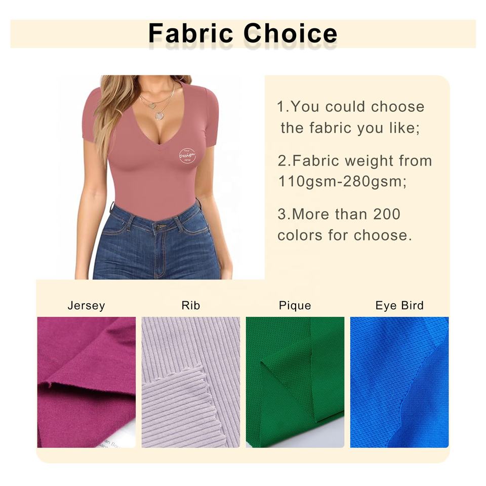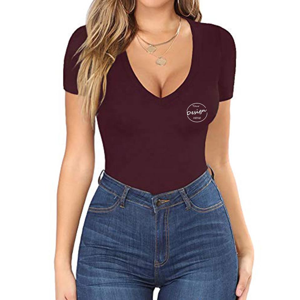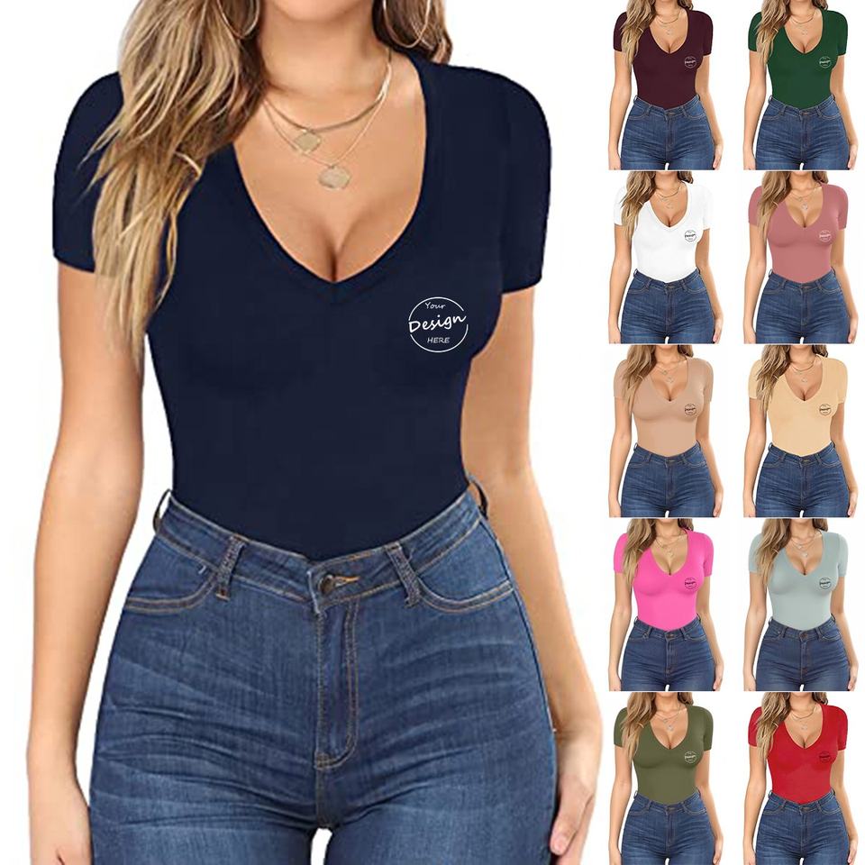 Camiseta de Verano para Mujer, Sexy, Sólida, con Cuello en V, Compresión, Bordado Personalizado, 95% Algodón, 5% Elastano, Alta Elasticidad, Transpirable, Ecológica