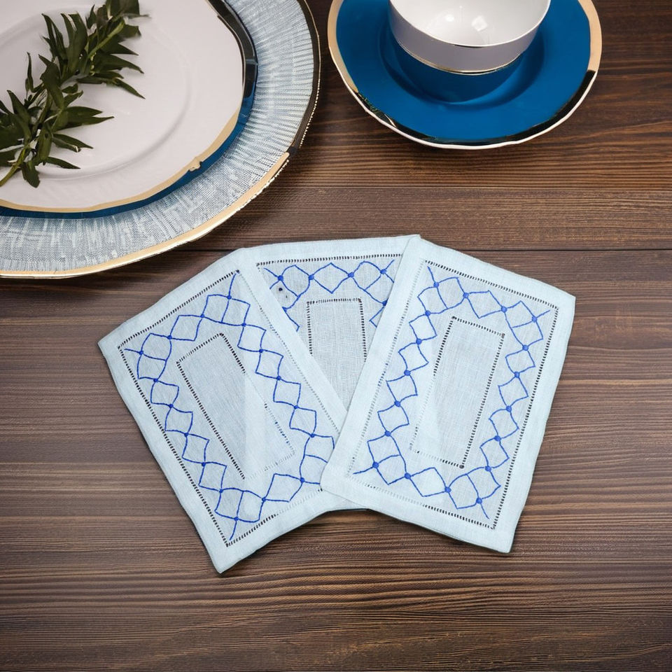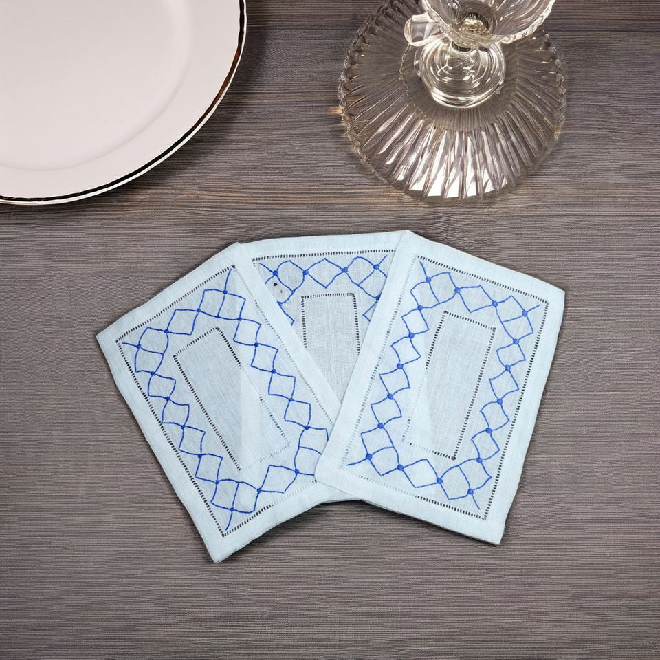 Servilletas de cóctel geométricas azules bordadas personalizadas 6x9 'servilleta de bebida de lino blanco Hemstitch para bodas Home Hotel