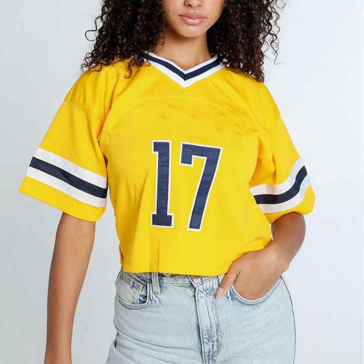 Camiseta sin mangas recortada con bordado personalizado, camiseta de fútbol americano transpirable con cuello en V para mujer con mangas cortas
