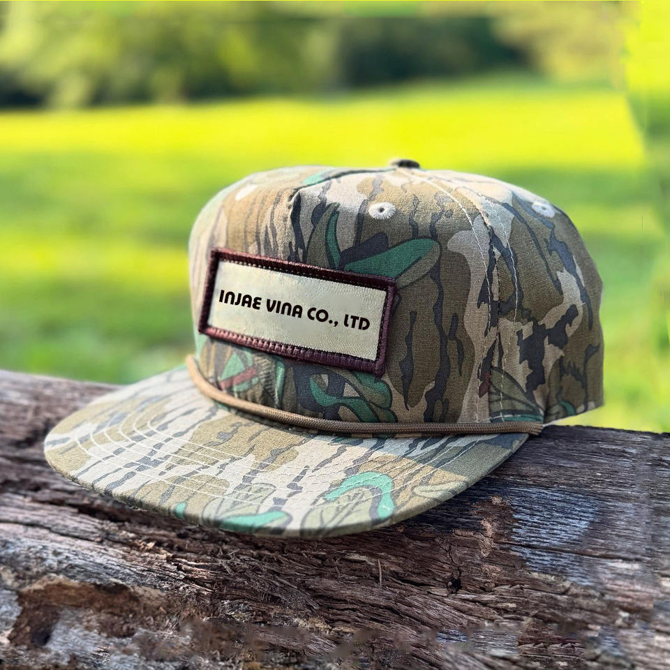 Parche bordado personalizado Logo5 Panel deporte sin estructura ala plana papá sombrero, Oem bordado Camo poliéster cuerda Gorras Snapback Cap