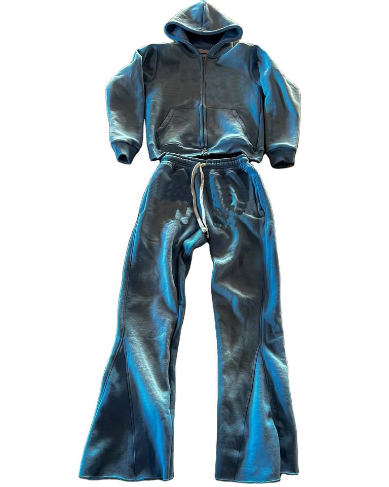 Conjunto Deportivo Personalizado con Bordado, Talla Grande, Lavado Ácido, Cierre de Cremallera, Estilo Desgastado, Sudadera con Capucha de Felpa Francesa de 500 Gsm, Pantalones Deportivos Acampanados