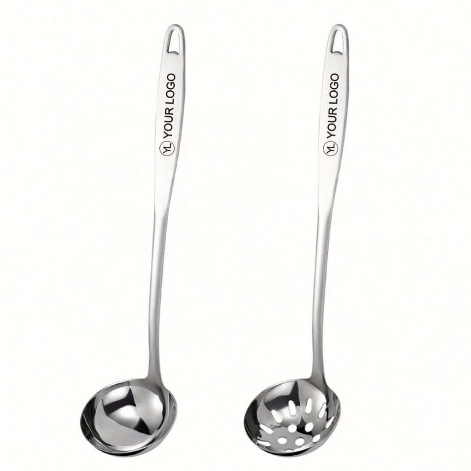 Cucharas ranuradas de acero inoxidable 304 premium con LOGO grabado personalizado, gran capacidad de cuenco, mango largo, aptas para lavavajillas, resistentes para sopa
