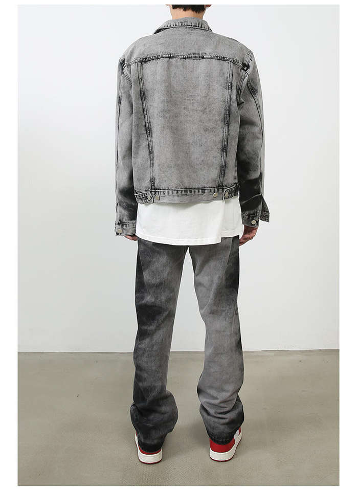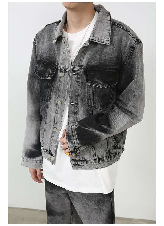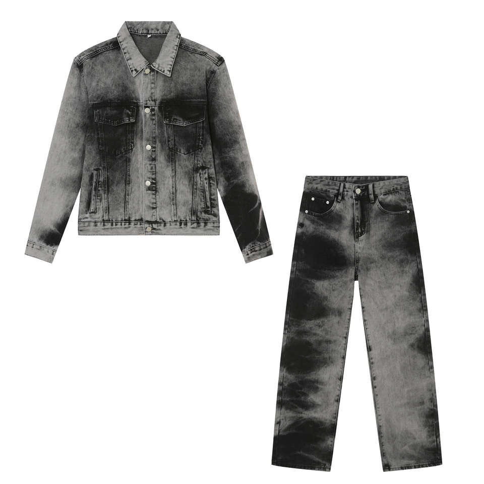 Conjunto de 2 piezas de mezclilla para hombre: Chaqueta y pantalones vaqueros con lavado desgastado y teñido a la piedra, estilo Hip Hop de primavera.