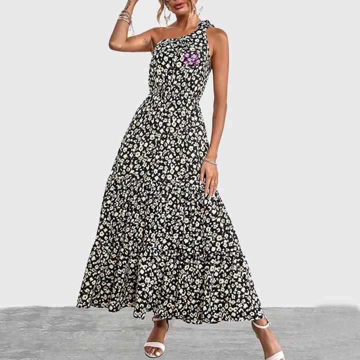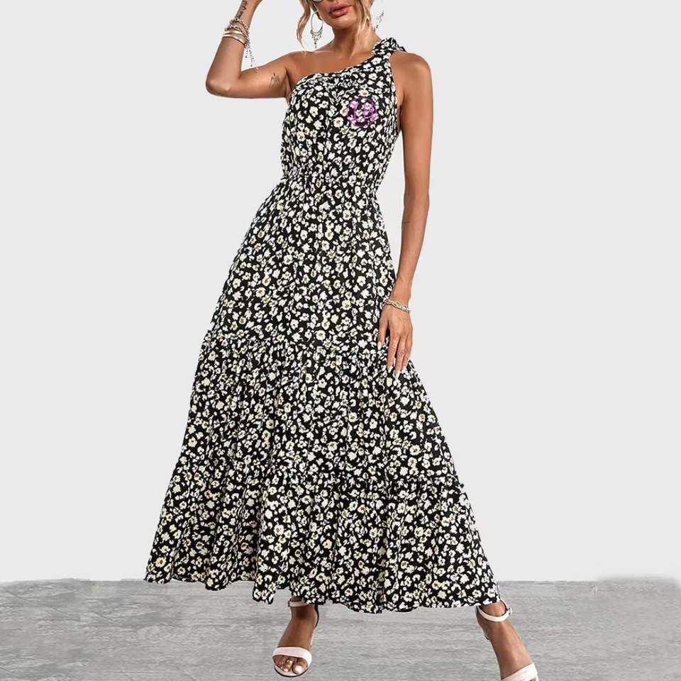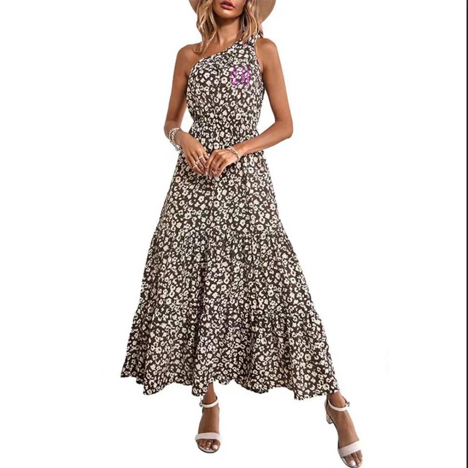 Vestido de Playa de Verano Personalizado de Fábrica, Vestido Largo Informal de un Solo Hombro sin Mangas para Mujer, Vestido de Gasa Tejida con Estampado Floral, Cintura Alta, Corte en A