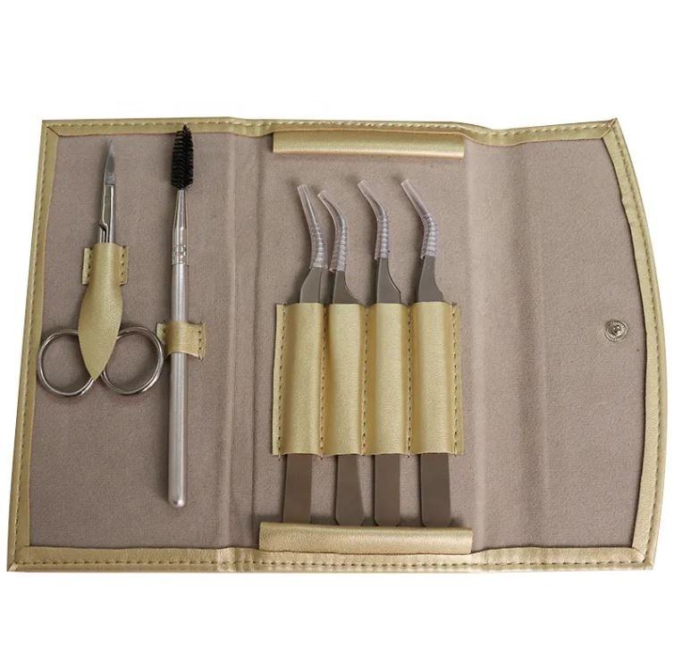 Juego de Pinzas Profesionales de Acero Inoxidable para Extensión de Pestañas con Tijeras, Cepillo y Estuche de Cuero PU
