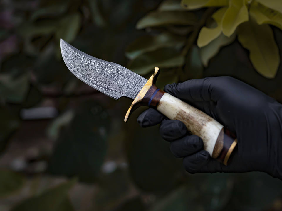 Cuchillo de Caza Personalizado de Hoja Fija de Acero de Damasco de Alta Durabilidad con Punta Clip y Mango de Cuerno de Ciervo para Uso en Exteriores con 3 Años de Garantía