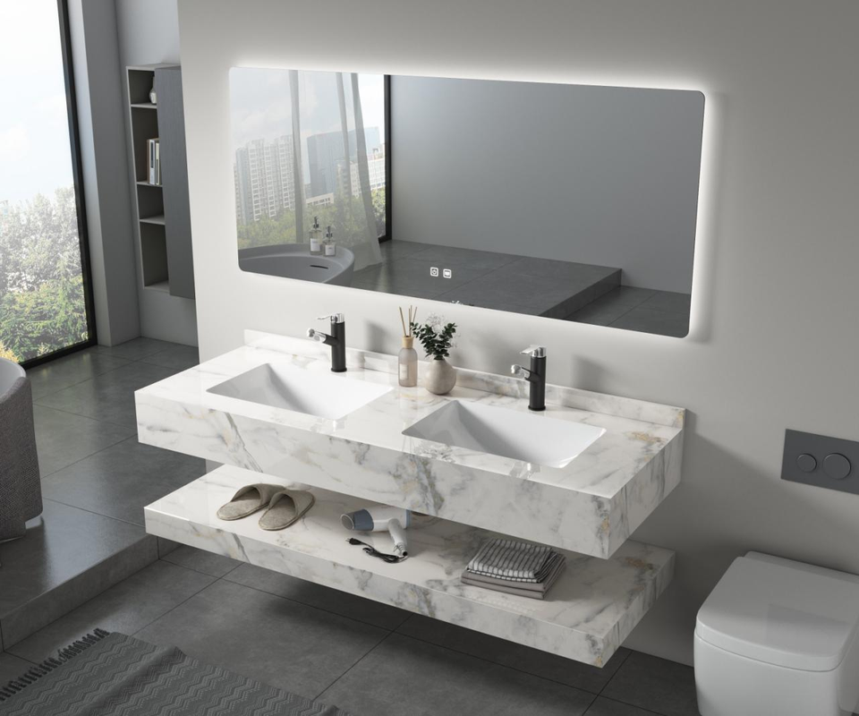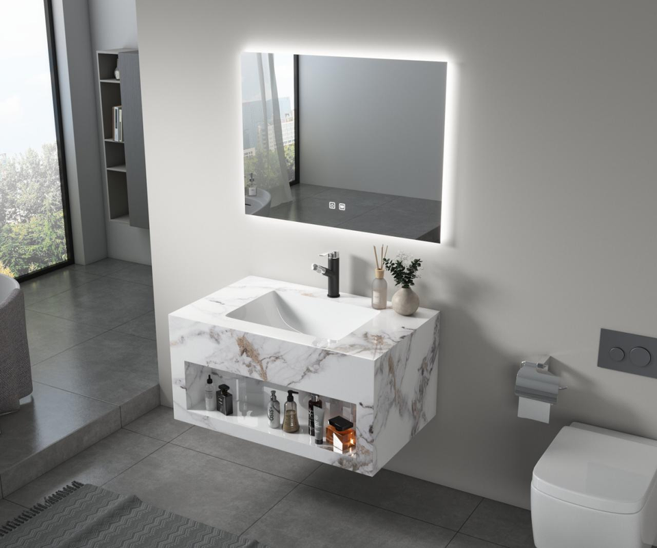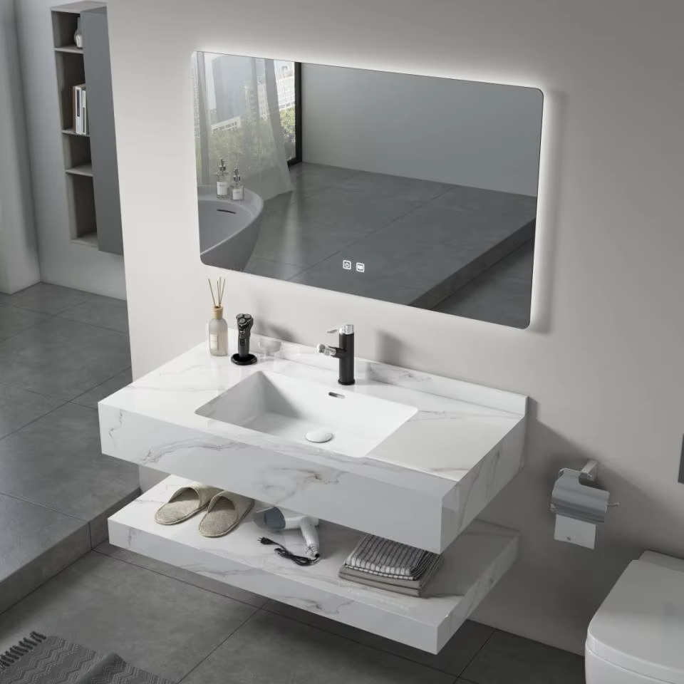 Vanidad de baño flotante personalizada con fregadero Vanidad de baño de placa de roca montada en la pared moderna de lujo