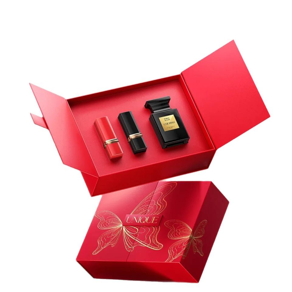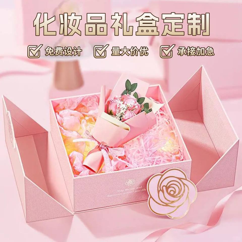 Caja de regalo cosmética plegable personalizada con forma de libro, tapa de una pieza y doble puerta para set de cuidado de la piel