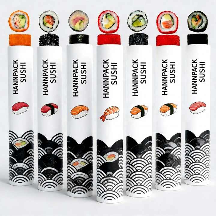 Caja Cilíndrica para Sushi Personalizada de Grado Alimenticio con Asa, Reciclable, Biodegradable, de Papel Kraft, Impresión a Cuatro Colores y Recubrimiento UV