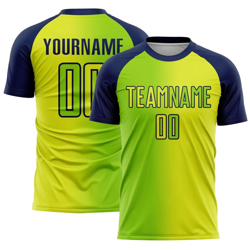 Conjunto de Uniforme de Fútbol Personalizado, Jersey y Pantalones Cortos de Poliéster Transpirable en Verde, Amarillo y Azul, Impresión de Logotipo, Nombre y Número del Equipo