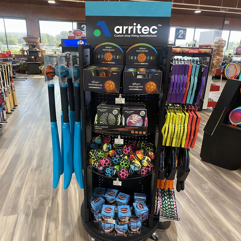 Expositor giratorio de cuatro lados personalizado para juguetes acuáticos, soporte metálico para exhibición de fútbol acuático, soporte para disco Wingman