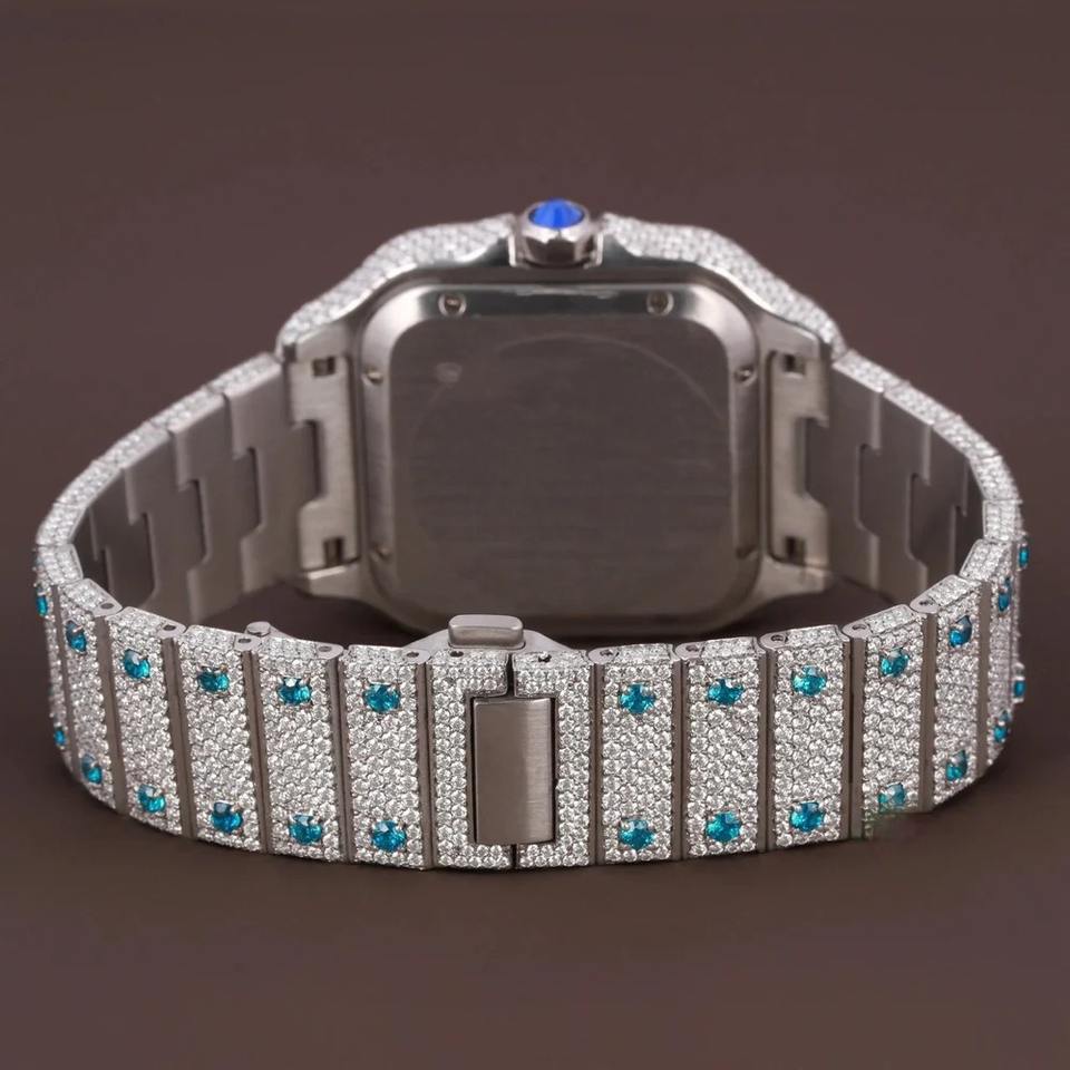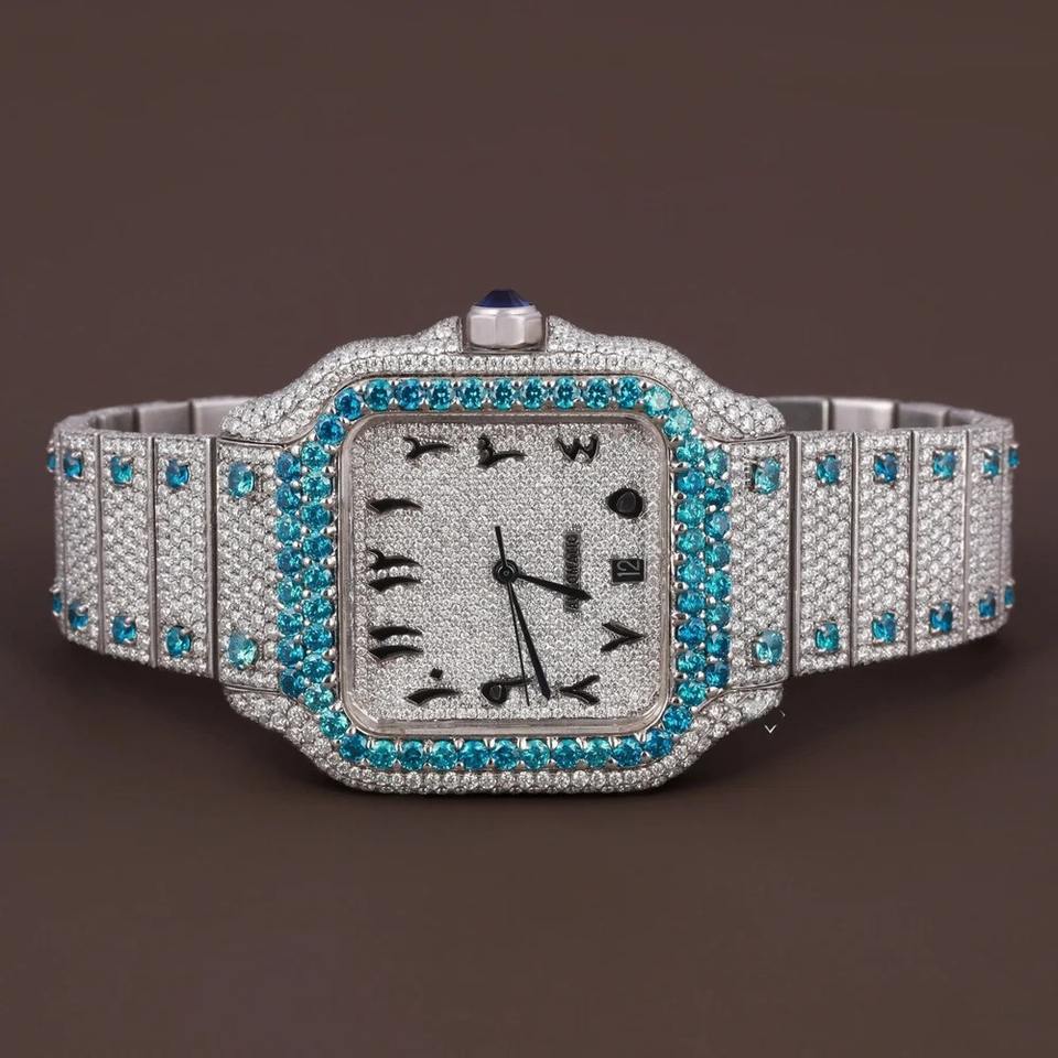 Reloj Cronógrafo Personalizado con Incrustaciones de Diamantes, Correa Azul y Blanca para Hombre, Diamantes Moissanite VVS, Esfera Árabe, Estilo Hip Hop