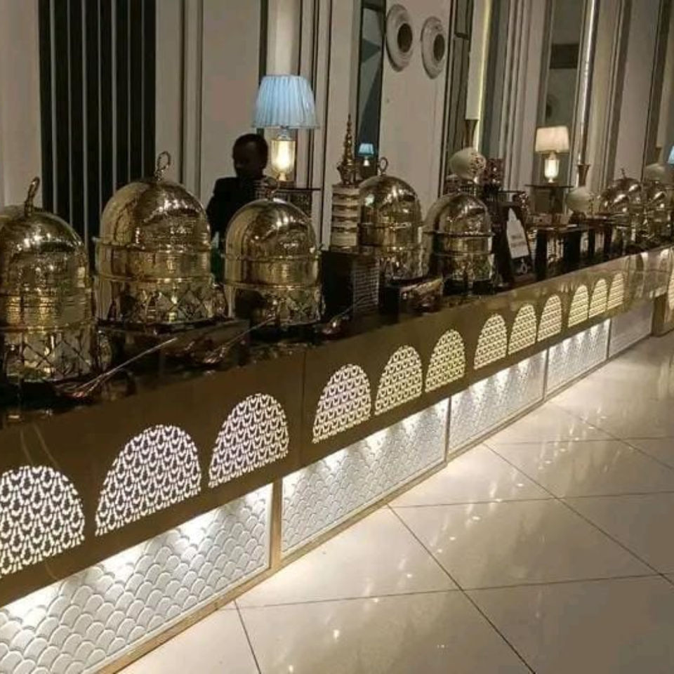Mostrador de buffet de boda brillante personalizado con paneles iluminados y tema oscuro para recepciones y fiestas de lujo