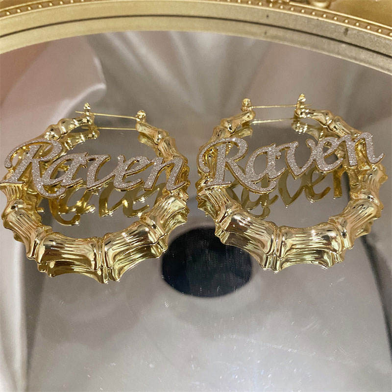Pendientes de aro personalizados en color oro para mujer, chapados en oro PVD de 14k y 18k, de acero inoxidable 316L, con nombre personalizado, diseño de bambú.
