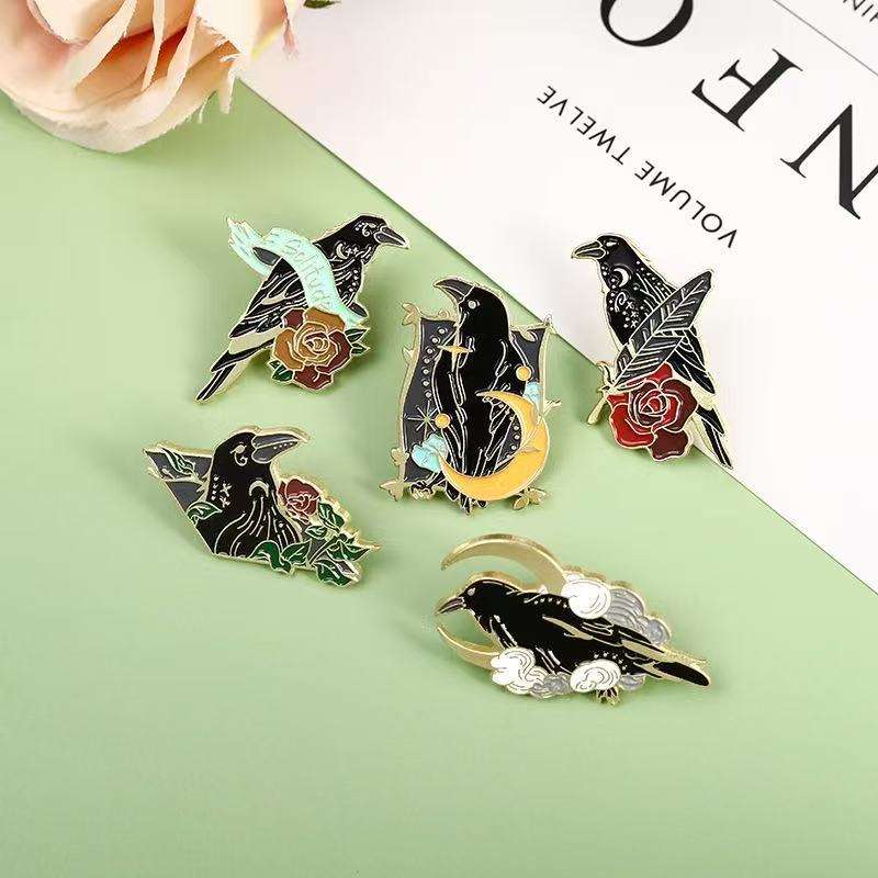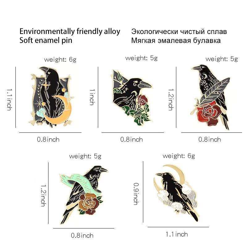 Broches Personalizados de Estilo Gótico Punk con Diseño de Cuervo, Luna, Flores y Plumas, en Aleación Metálica Plateada con Técnica de Esmalte Suave UV para Bolsos